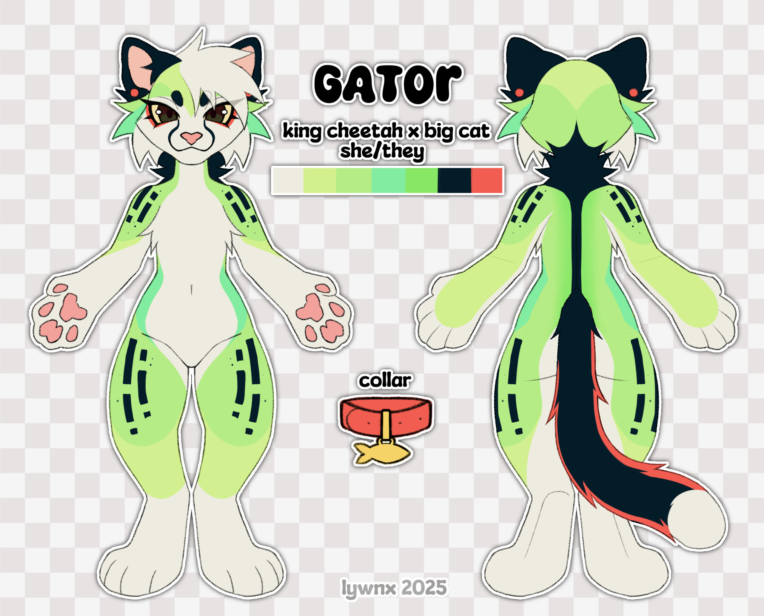 FERAL: feral view, headshot, 2 small accessories, info + palette.